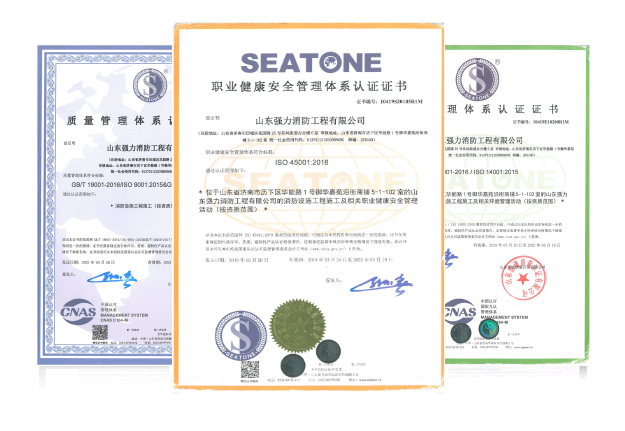 【山東強(qiáng)力消防工程有限公司】是經(jīng)山東省工商局批準(zhǔn)注冊(cè),擁有中華人民共和國(guó)住房和城鄉(xiāng)建設(shè)部核發(fā)的“消防設(shè)施工程設(shè)計(jì)與施工壹級(jí)資質(zhì)”、山東省公安廳消防局核發(fā)的“消防設(shè)施維護(hù)保養(yǎng)檢測(cè)壹級(jí)資質(zhì)”。公司專(zhuān)門(mén)從事建筑消防工程中的火災(zāi)自動(dòng)報(bào)警聯(lián)動(dòng)系統(tǒng)、自動(dòng)噴水滅火系統(tǒng)、氣體滅火系統(tǒng)、室內(nèi)外消火栓系統(tǒng)及消防廣播通訊系統(tǒng)的圖紙?jiān)O(shè)計(jì)、施工安裝、調(diào)試開(kāi)通及維修保養(yǎng)。公司注冊(cè)資金6600萬(wàn)元,獲得GB/T 19001-2008(質(zhì)量管理體系)、GB/T24001-2004(環(huán)境管理體系)、GB/T28001-2011(職業(yè)健康安全管理體系)認(rèn)證,并被山東省工商行政管理局評(píng)為“省級(jí)守合同重信用企業(yè)”。